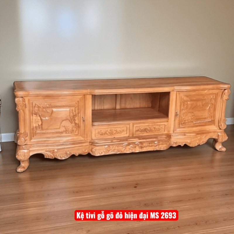 Kệ tivi gỗ gõ đỏ hiện đại là lựa chọn lý tưởng cho những ai yêu thích sự kết hợp giữa thiết kế tinh tế và chất lượng vượt trội. Sản phẩm được chế tác từ gỗ gõ đỏ tự nhiên, mang đến vẻ đẹp ấm áp, sang trọng, phù hợp với mọi phong cách nội thất hiện đại. Với đường nét chạm khắc tinh xảo và chân đế vững chãi, kệ tivi gỗ gõ đỏ hiện đại không chỉ là nơi đặt TV mà còn là điểm nhấn thẩm mỹ cho phòng khách.