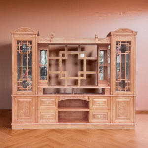 - Hai bên tủ kính: Được thiết kế như một tủ trang trí để rượu hoặc đồ trang trí, tạo điểm nhấn cho không gian phòng khách.